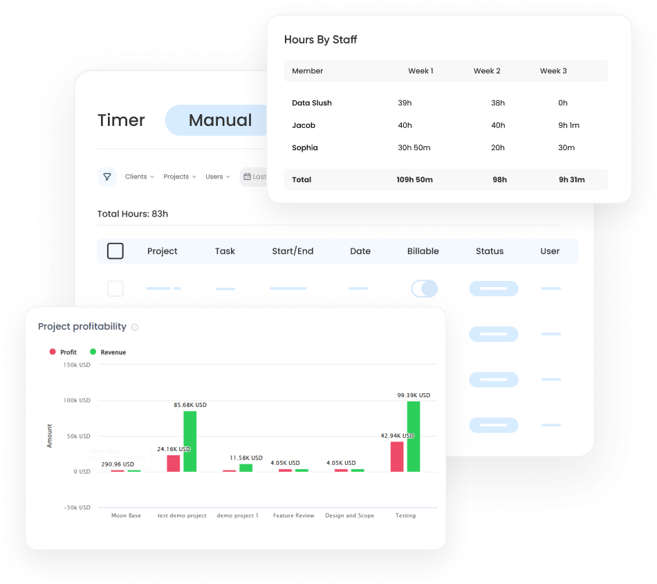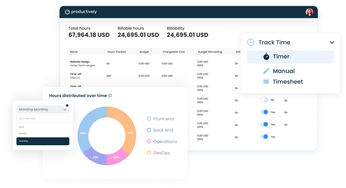 Agencies can utilize Productively to generate various reports for budgeting, hours worked, and invoicing, with options to schedule reports or export them for easy reference. Our reports make it simple to track billable time, monitor project profitability, and send out invoices.