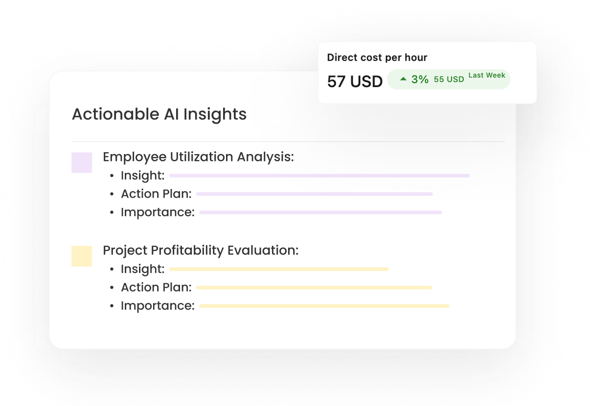 Our tool goes beyond basic time tracking—it’s built specifically for professional service businesses. With AI-powered insights, it analyzes project performance, team utilization, and financial metrics, delivering actionable recommendations to optimize workflows and boost profitability.